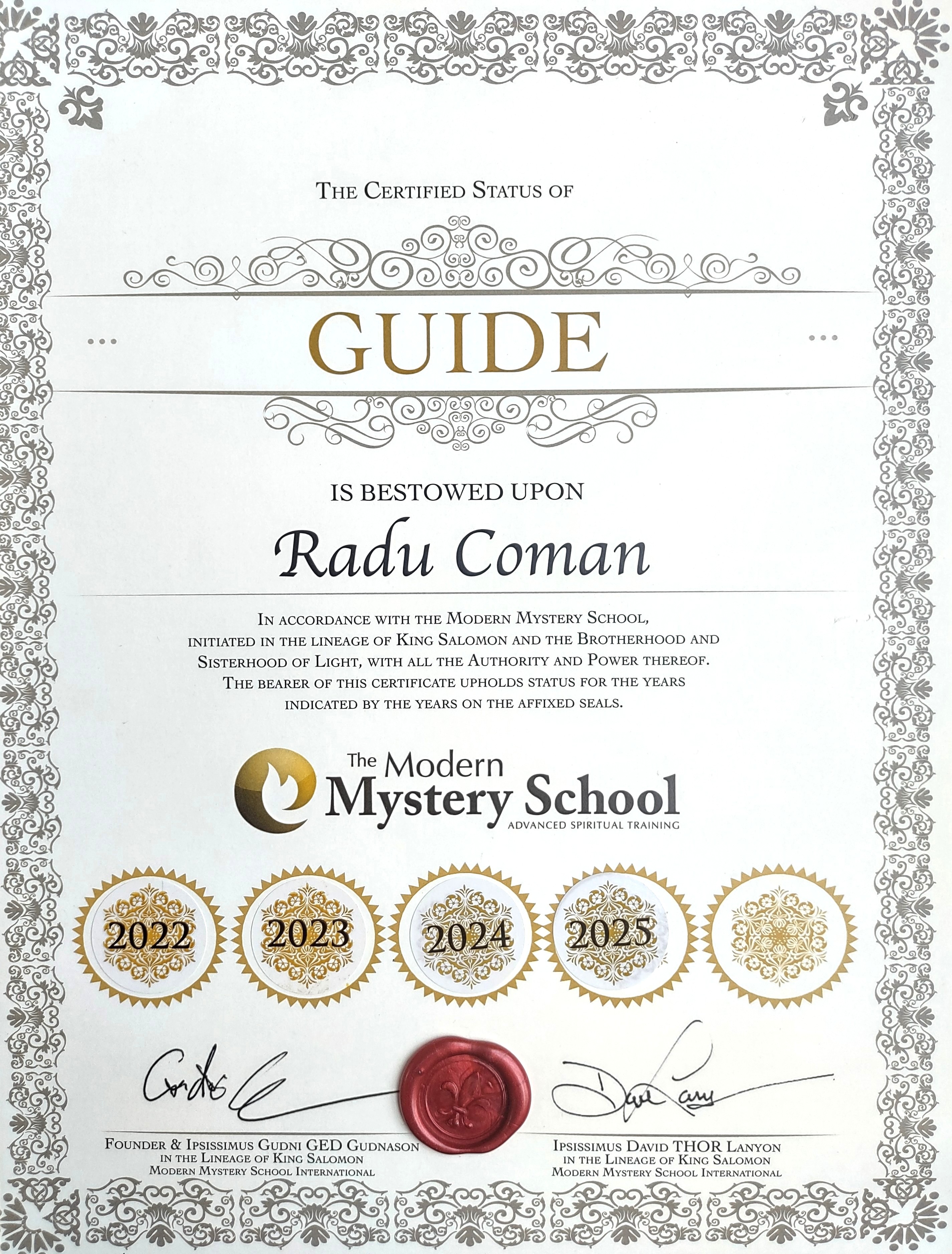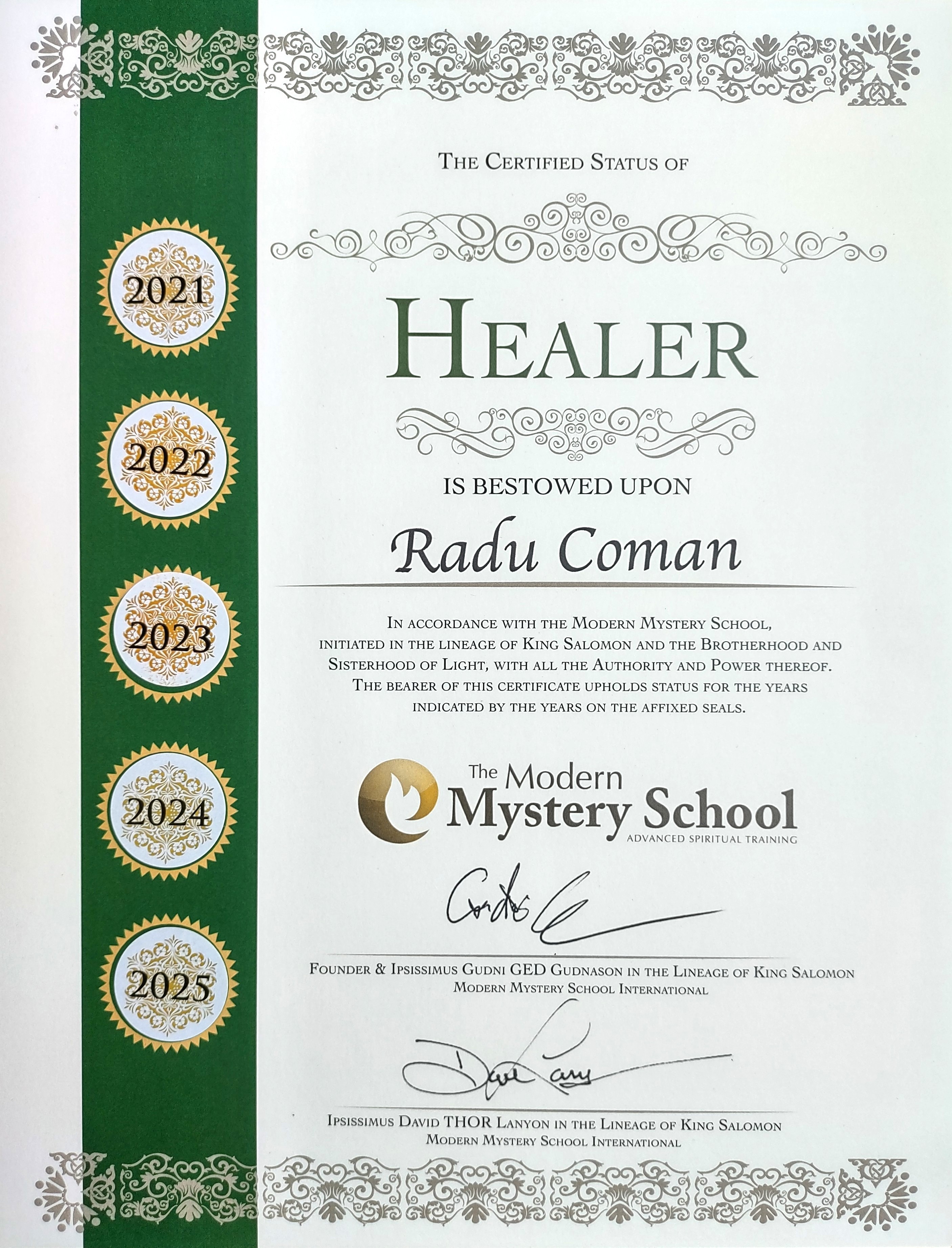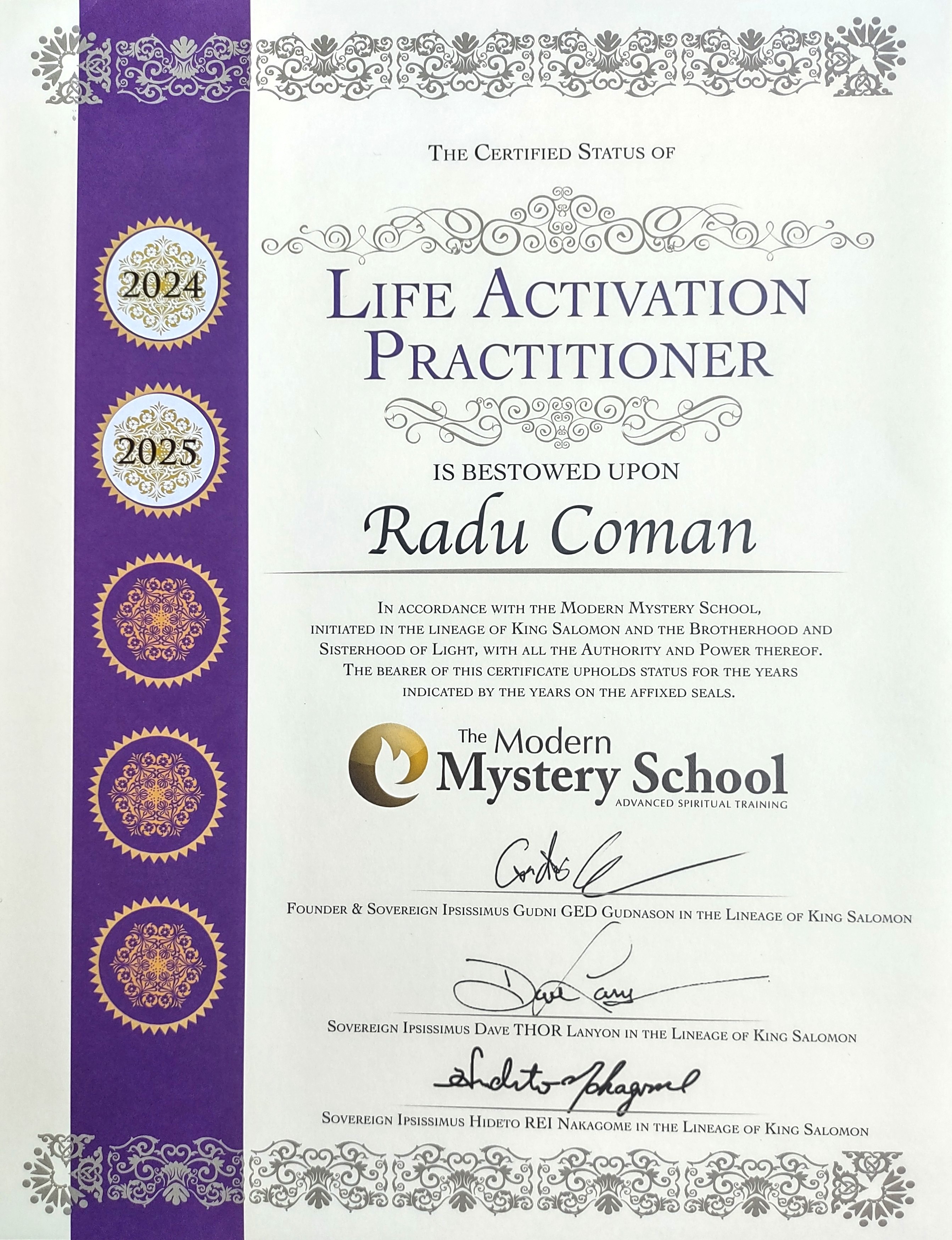 The certifications for the classes, initiations and healing sessions that Radu offers come from Modern Mystery School International.