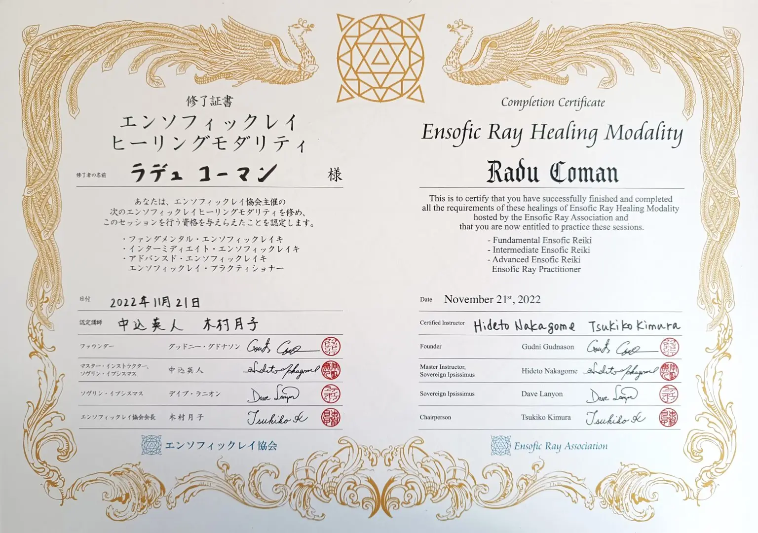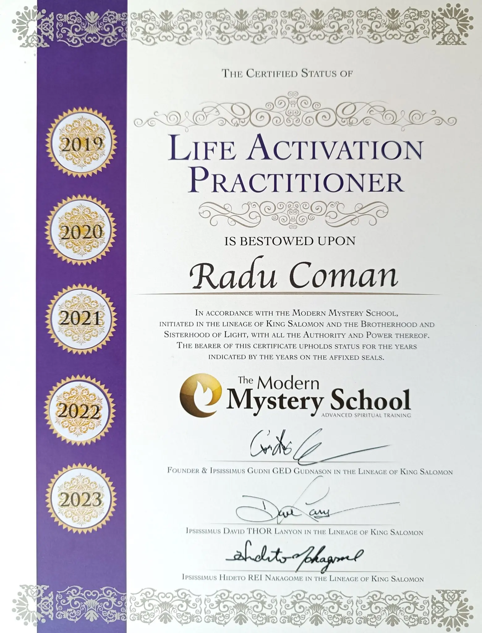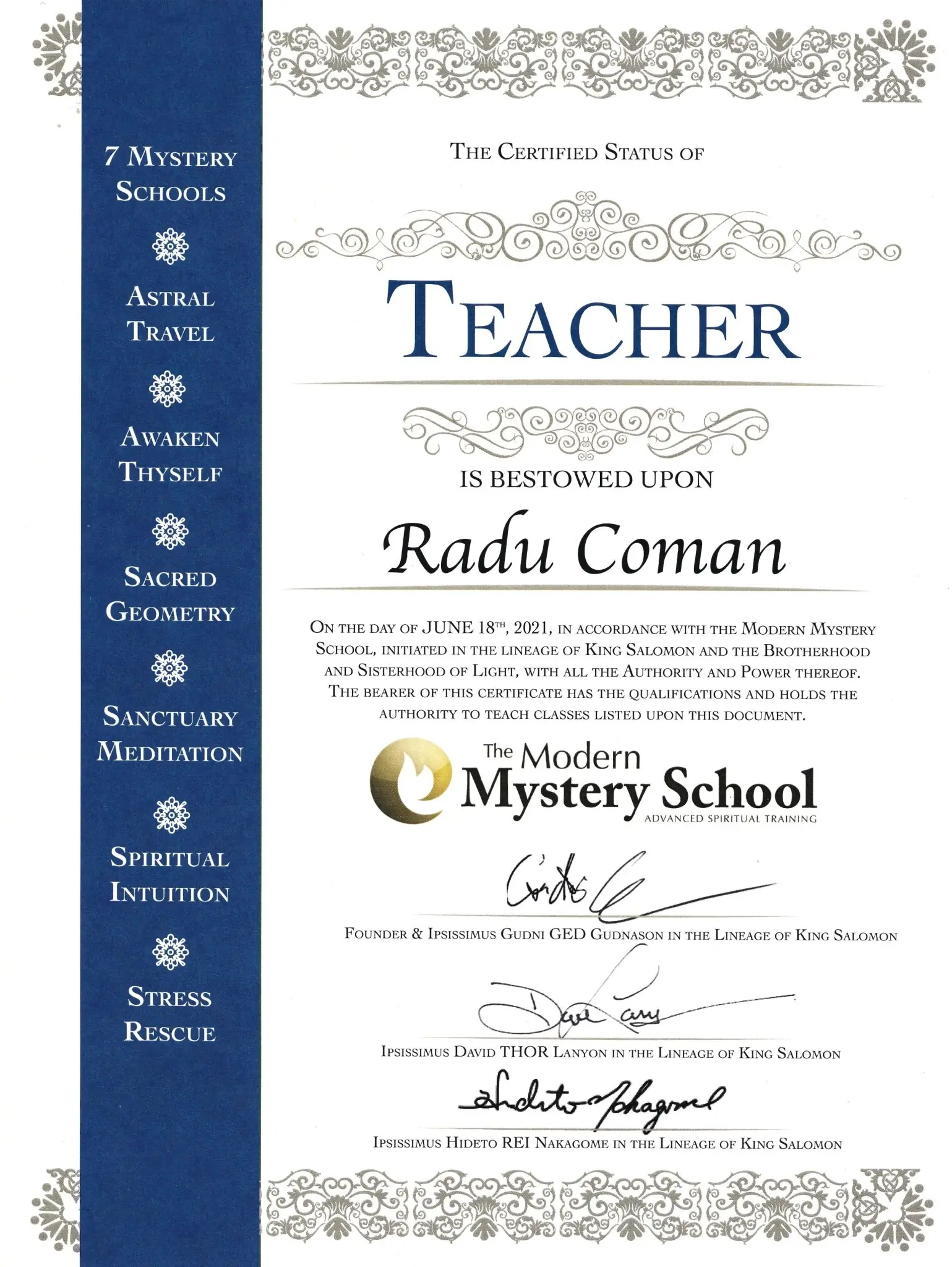 The certifications for the classes, initiations and healing sessions that Radu offers come from Modern Mystery School International.